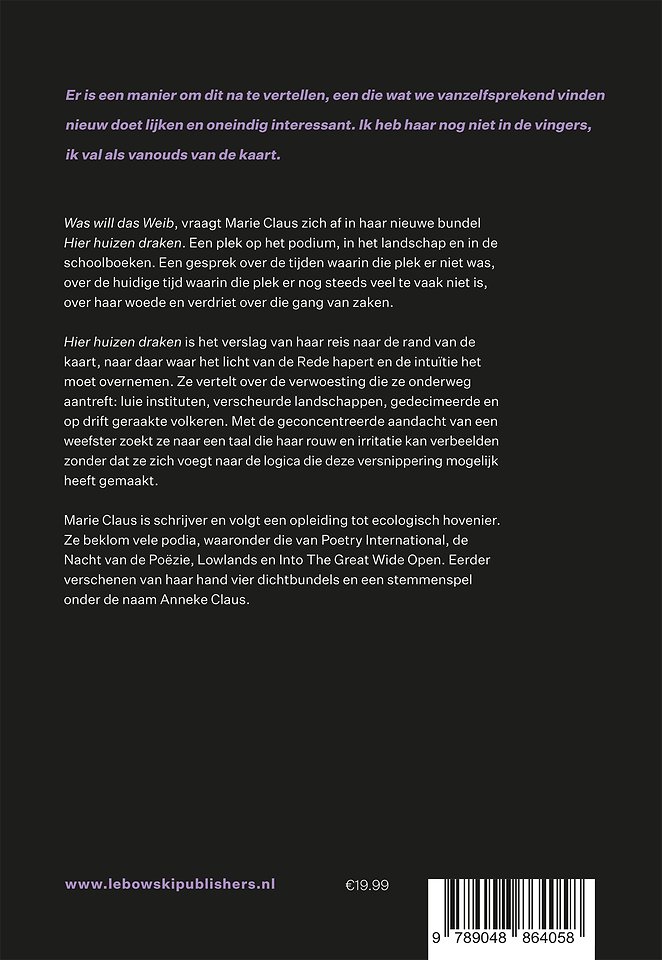 Was will das Weib, vraagt Marie Claus zich af in haar nieuwe bundel Hier huizen draken. Een plek op het podium, in het landschap en in de schoolboeken. Een gesprek over de tijden waarin die plek er niet was, over de huidige tijd waarin die plek er nog steeds veel te vaak niet is, over haar woede en verdriet over die gang van zaken. Hier huizen draken is het verslag van haar reis naar de rand van de kaart, naar daar waar het licht van de Rede hapert en de intuïtie het moet overnemen. Ze vertelt over de verwoesting die ze onderweg aantreft: luie instituten, verscheurde landschappen, gedecimeerde en op drift geraakte volkeren. Met de geconcentreerde aandacht van een weefster zoekt ze naar een taal die haar rouw en irritatie kan verbeelden zonder dat ze zich voegt naar de logica die deze versnippering mogelijk heeft gemaakt.