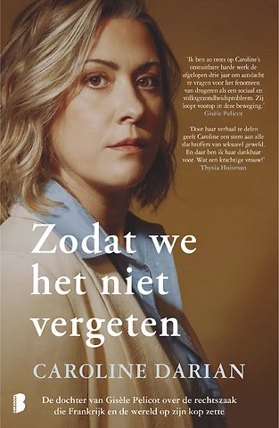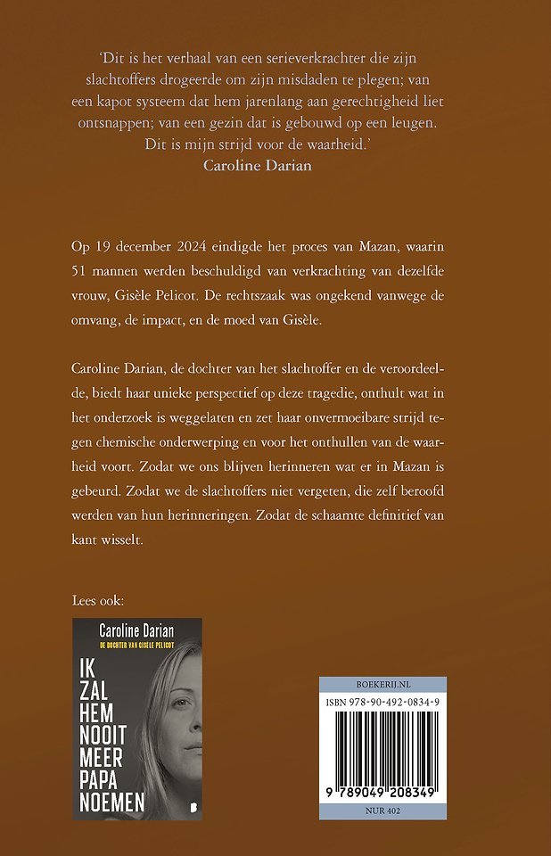 Caroline Darian, de dochter van het slachtoffer en de veroordeelde, biedt haar unieke perspectief op deze tragedie, onthult wat in het onderzoek is weggelaten en zet haar onvermoeibare strijd tegen chemische onderwerping en voor het onthullen van de waarheid voort. Zodat we ons blijven herinneren wat er in Mazan is gebeurd. Zodat we de slachtoffers niet vergeten, die zelf beroofd werden van hun herinneringen. Zodat de schaamte definitief van kant wisselt.