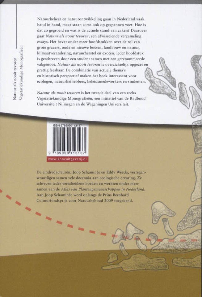 Beschouwingen over natuurbeheer in Nederland. Natuur en natuurontwikkeling gaan in Nederland vaak hand in hand. Hoe is dat in het verleden zo gegroeid en wat zijn de actuele ontwikkelingen? Daarover gaat dit boek, een afwisselende verzameling essays over onder meer de rol van grote grazers, oude en nieuwe bossen, landbouw en natuur, klimaatverandering en exoten.