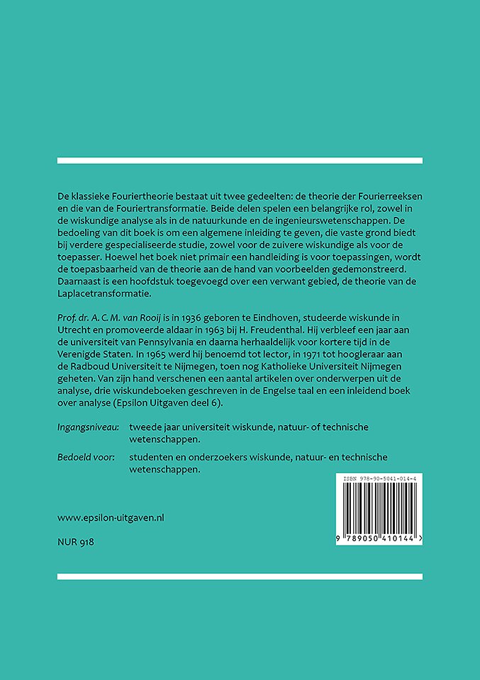 De klassieke Fouriertheorie bestaat uit twee gedeelten: de theorie der Fourierreeksen en die van de Fouriertransformatie. Beide delen spelen een belangrijke rol, zowel in de wiskundige analyse als in de natuurkunde en de ingenieurswetenschappen. De bedoeling van het boek is om een algemene inleiding te geven, die vaste grond biedt bij verdere gespecialiseerde studie, zowel voor de zuivere wiskunde als voor de toepasser. Hoewel het boek niet primair een handleiding is voor toepassingen, wordt de toepasbaarheid van de theorie aan de hand van voorbeelden gedemonstreerd. Daarnaast is een hoofdstuk toegevoegd over een verwant onderwerp, de theorie van de Laplacetransformatie.