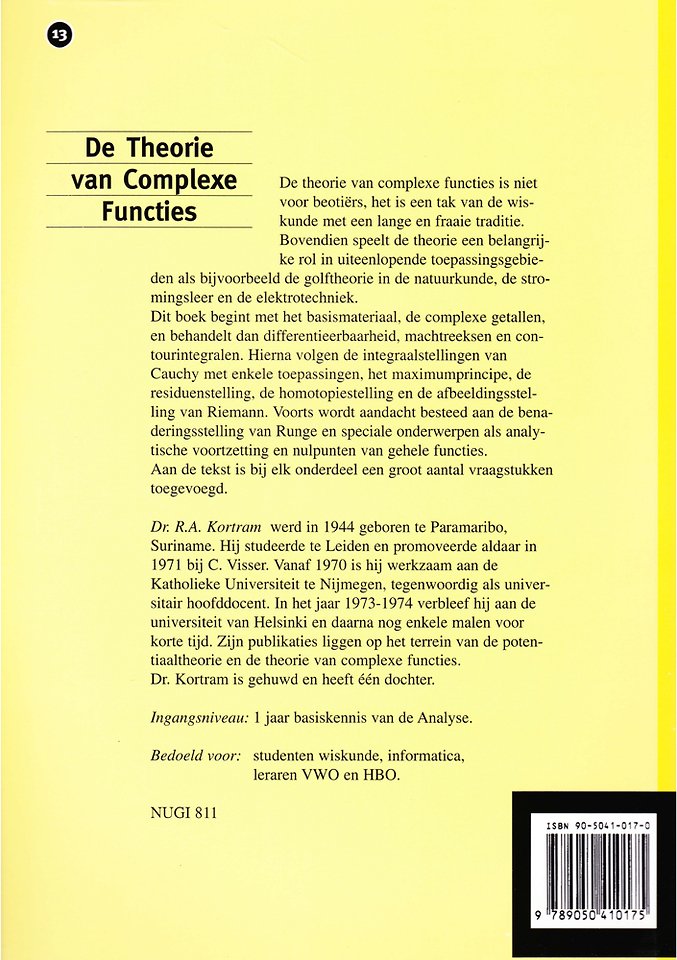 De theorie van de complexe functies is een tak van de wiskunde met een lange en fraaie traditie. Bovendien speelt de theorie een belangrijke rol in uiteenlopende toepassingsgebieden als bijvoorbeeld de golftheorie in de natuurkunde, de stromingsleer en de elektrotechniek. Dit boek begint met het basismateriaal, de complexe getallen, en behandelt dan differentieerbaarheid, machtreeksen en contourintegralen. Hierna volgen de integraalstellingen van Cauchy met enkele toepassingen, het maximumprincipe, de residuenstelling, de homotopiestelling en de afbeeldingsstelling van Riemann. Voorts wordt aandacht besteed aan de benaderingsstelling van Runge en speciale onderwerpen als analytische voortzetting en nulpunten van gehele functies. Aan de tekst is bij elk onderdeel een groot aantal vraagstukken toegevoegd.