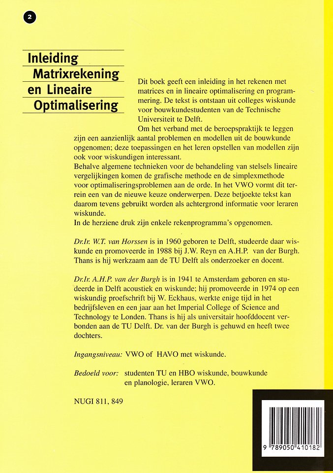 Dit boek geeft een inleiding in het rekenen met matrices en in lineaire optimalisering en programmering. De tekst is ontstaan uit colleges wiskunde voor bouwkundestudenten van de Technische Universiteit te Delft.