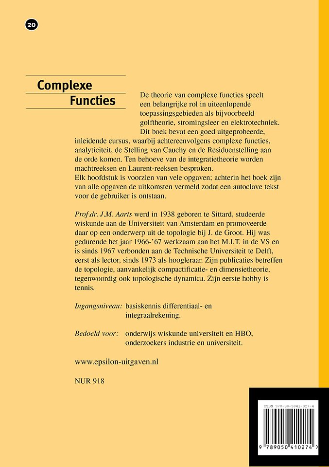 De theorie van complexe functies speelt een belangrijke rol in uiteenlopende toepassingsgebieden als bijvoorbeeld golftheorie, stromingsleer en electrotechniek. Dit boek bevat een goed uitgeprobeerde, inleidende cursus, waarbij achtereenvolgens complexe functies, analyticiteit, de Stelling van Cauchy en de Residuenstelling aan de orde komen. Ten behoeve van de integratietheorie worden machtreeksen en Laurent-reeksen besproken. Elk hoofdstuk is voorzien van vele opgaven. Achter in het boek zijn van alle opgaven de uitkomsten vermeld zodat een autoclave tekst voor de gebruiker is ontstaan.