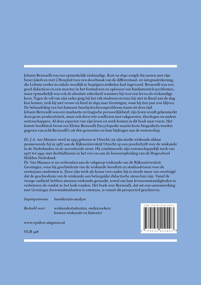 Johann Bernoulli was een opmerkelijk wiskundige. Kort na 1690 zorgde hij samen met zijn broer Jakob en met L’Hospital voor een doorbraak van de differentiaal- en integraalrekening, die Leibniz eerder in enkele moeilijk te begrijpen artikelen had ingevoerd. Bernoulli was een goed didacticus en een meester in het formuleren en oplossen van fundamentele problemen, maar opmerkelijk was ook de absolute zekerheid waarmee hij voor een leven als wiskundige koos. Tegen de wil van zijn vader ging hij het vak studeren en toen hij niet in Basel aan de slag kon komen trok hij met vrouw en kind in 1695 naar Groningen waar hij tien jaar zou blijven. De behandeling van het fameuze brachystochroonprobleem stamt uit deze tijd. Johann Bernoulli was een markante en tragische persoonlijkheid; zijn leven wordt gekenmerkt door grote productiviteit, maar ook door vele conflicten met vakgenoten, theologen en andere wetenschappers. Al deze aspecten van zijn leven en werk komen in dit boek naar voren. Het laatste hoofdstuk bevat een Kleine Bernoulli Encyclopedie waarin korte biografieën worden gegeven van acht Bernoulli’s uit drie generaties en hun bijdragen aan de wetenschappen.