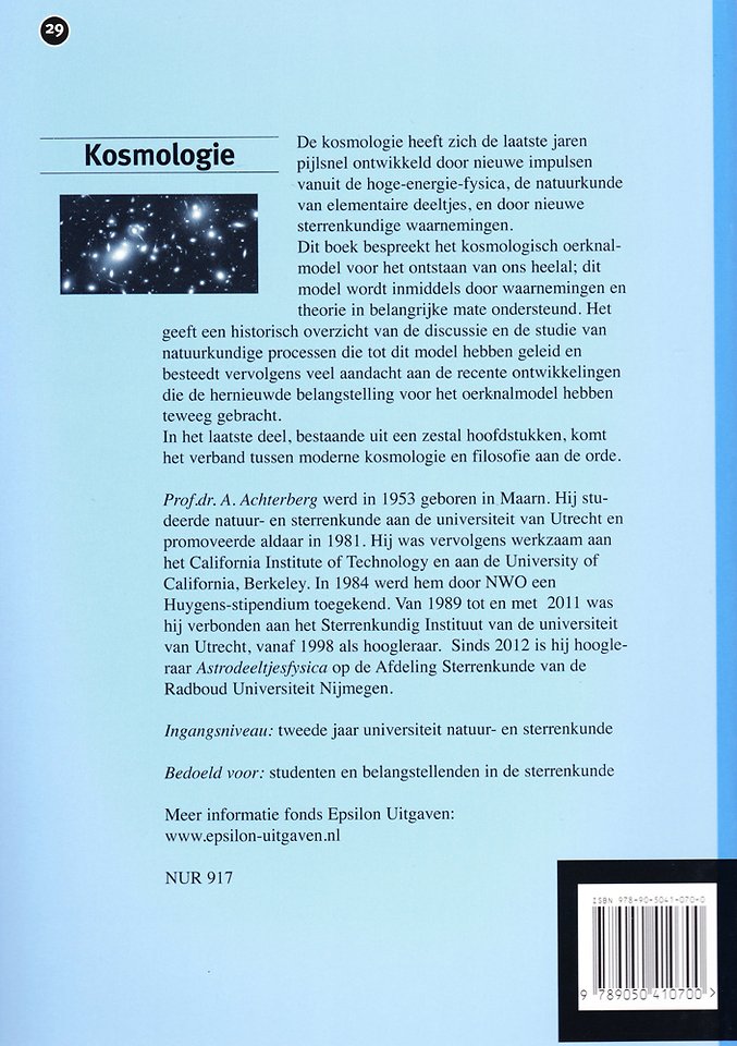 De kosmologie heeft zich in de laatste jaren pijlsnel ontwikkeld door nieuwe impulsen vanuit de hoge-energie-fysica, de natuurkunde van elementaire deeltjes, en door de nieuwe sterrenkundige waarnemingen. Dit boek bespreekt het kosmologisch oerknalmodel voor het ontstaan van ons heelal; dit model wordt inmiddels door waarnemingen en theorie in belangrijke mate ondersteund. Het geeft een historisch overzicht van de discussie en de studie van natuurkundige processen die tot dit model hebben geleid en besteedt vervolgens veel aandacht aan de recente ontwikkelingen die de hernieuwde belangstelling voor het oerknalmodel hebben teweeg gebracht. In het laatste deel, bestaande uit een zestal hoofdstukken, komt het verband tussen moderne kosmologie en filosofie aan de orde.