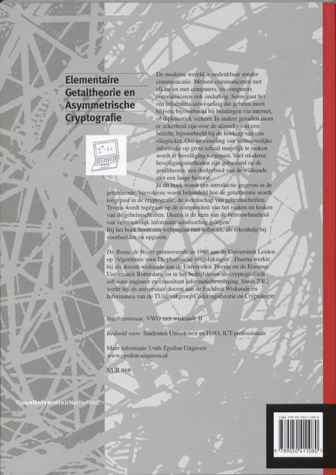 In dit boek wordt een introductie gegeven in de getaltheorie. Vervolgens wordt behandeld hoe de getaltheorie wordt toegepast in de cryptografie, de wetenschap van geheimschriften. Tevens wordt ingegaan op de complexiteit van het maken en kraken van de geheimschriften. Daarin is de kern van de betrouwbaarheid van vertrouwelijk informatie-uitwisseling gelegen.