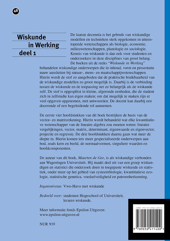 De eerste vier hoofdstukken van dit boek bestrijken de basis van de vector- en matrixrekening. Hierin wordt behandeld wat elke kwantitatieve wetenschapper van de lineaire algebra zou moeten weten: lineaire vergelijkingen, vector, matrix, determinant, eigenwaarde en eigenvector, projectie en regressie. De drie hoofdstukken daarna gaan wat meer de diepte in. Hierin komen iets meer gespecialiseerde onderwerpen aan bod, zoals kern en beeld, de normaalvormen, singuliere waarden en hoofdcomponenten.