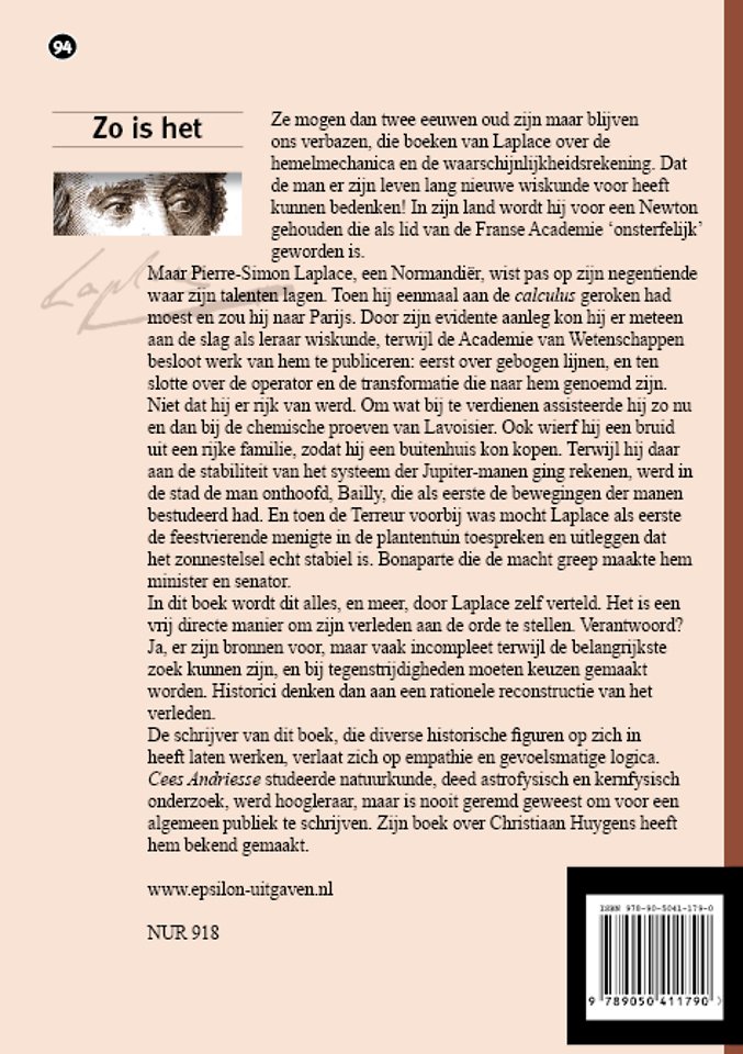 Ze mogen dan twee eeuwen oud zijn maar blijven ons verbazen, die boeken van Laplace over de hemelmechanica en de waarschijnlijkheidsrekening. Dat de man er zijn leven lang nieuwe wiskunde voor heeft kunnen bedenken! In zijn land wordt hij voor een Newton gehouden die als lid van de Franse Academie ‘onsterfelijk’ geworden is.