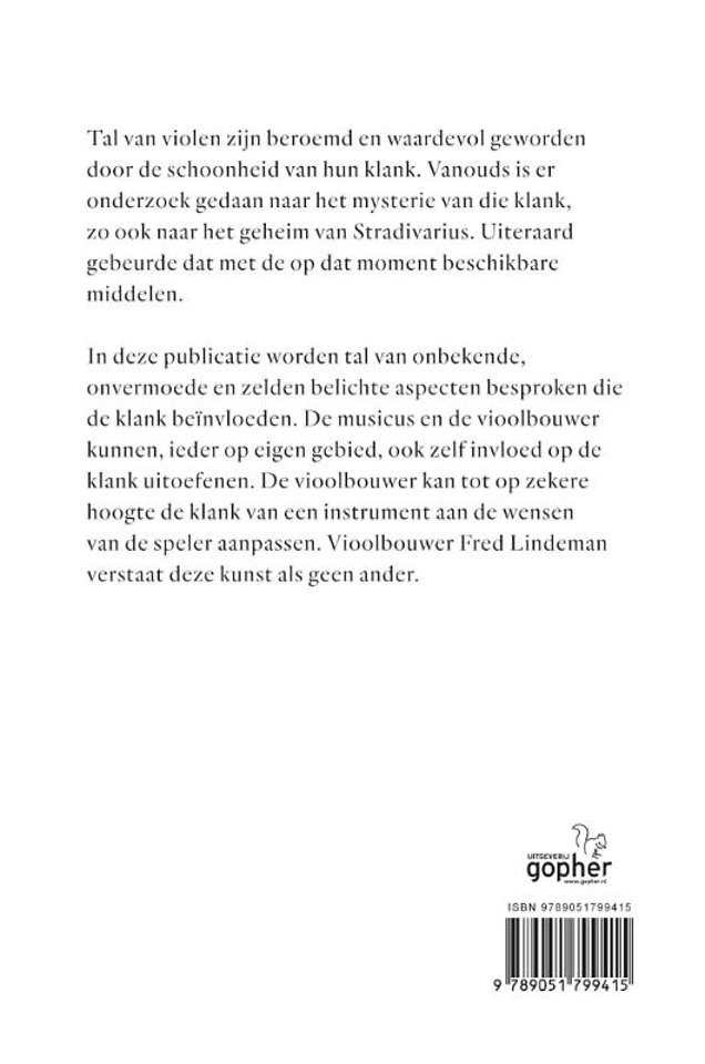 In deze publicatie worden tal van onbekende, onvermoede en zelden belichte aspecten besproken die de klank beïnvloeden. De musicus en de vioolbouwer kunnen, ieder op eigen gebied, ook zelf invloed op de klank uitoefenen. De vioolbouwer kan tot op zekere hoogte de klank van een instrument aan de wensen van de speler aanpassen. Vioolbouwer Fred Lindeman verstaat deze kunst als geen ander.