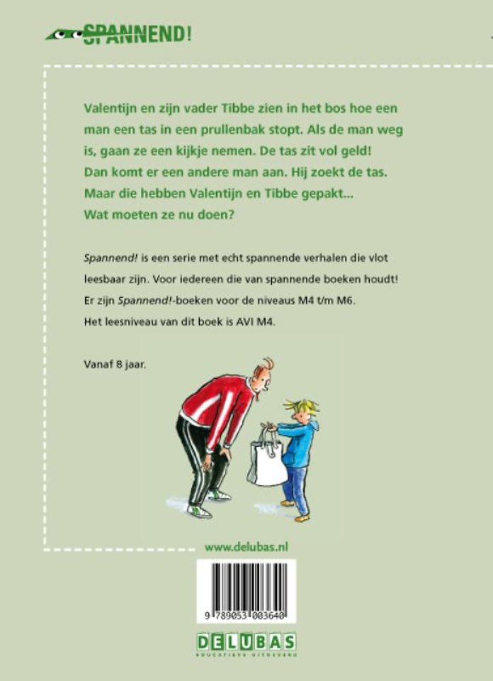 Valentijn en zijn vader Tibbe zien in het bos hoe een man een tas in een prullenbak stopt. Als de man weg is, gaan ze een kijkje nemen. De tas zit vol geld! Dan komt er een andere man aan. Hij zoekt de tas. Maar die hebben Valentijn en Tibbe gepakt... Wat moeten ze nu doen?