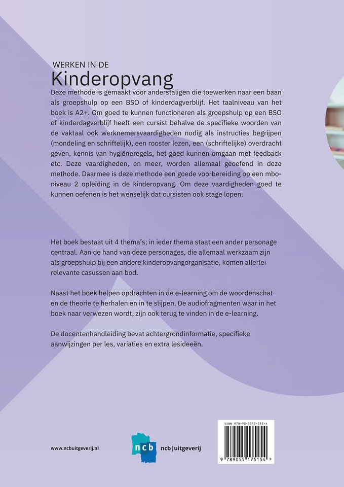 Deze methode is gemaakt voor anderstaligen die toewerken naar een baan als groepshulp op een BSO of kinderdagverblijf. Het taalniveau van het boek is A2+. Om goed te kunnen functioneren als groepshulp op een BSO of kinderdagverblijf heeft een cursist behalve de specifieke woorden van de vaktaal ook werknemersvaardigheden nodig als instructies begrijpen (mondeling en schriftelijk), een rooster lezen, een (schriftelijke) overdracht geven, kennis van hygiëneregels, het goed kunnen omgaan met feedback etc. Deze vaardigheden, en meer, worden allemaal geoefend in deze methode. Daarmee is deze methode een goede voorbereiding op een mbo-niveau 2 opleiding in de kinderopvang. Om deze vaardigheden goed te kunnen oefenen is het wenselijk dat cursisten ook stage lopen.