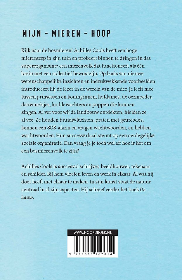 Kijk naar de bosmieren! Achilles Cools heeft een hoge mierenterp in zijn tuin en probeert binnen te dringen in dat superorganisme: een mierenvolk dat functioneert als één brein met een collectief bewustzijn. Op basis van nieuwe wetenschappelijke inzichten en indrukwekkende voorbeelden introduceert hij de lezer in de wereld van de mier. Je leeft mee tussen prinsessen en koninginnen, hofdames, de oermoeder, dauwmeisjes, kuddewachters en poppen die kunnen zingen. Al ver voor wij de landbouw ontdekten, hielden ze al vee. Ze houden bruidsvluchten, praten met geurcodes, kennen een SOS alarm, en vragen wachtwoorden. Hun succesverhaal steunt op een oerdegelijke sociale organisatie. Dan vraag je je toch wel af: hoe is het om een bosmierenvolk te zijn?