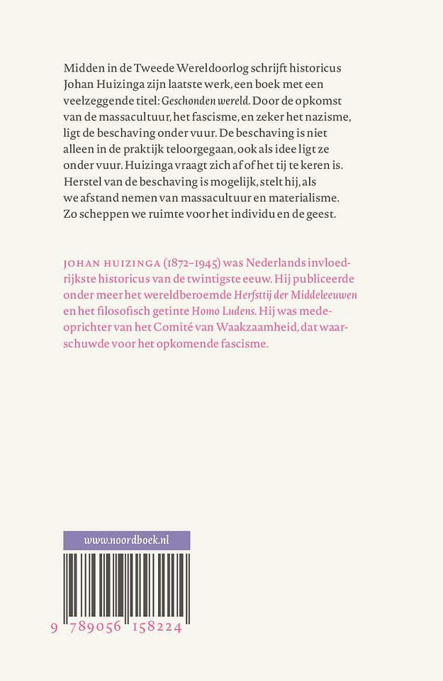 Midden in de Tweede Wereldoorlog schrijft historicus Johan Huizinga zijn laatste werk, een boek met een veelzeggende titel: De geschonden wereld. Door de opkomst van de massacultuur, het fascisme, en zeker het nazisme, ligt de beschaving onder vuur. De beschaving is niet alleen in de praktijk teloorgegaan, ook als idee ligt ze onder vuur. Huizinga vraagt zich af of het tij te keren is. Herstel van de beschaving is mogelijk, stelt hij, als we afstand nemen van massacultuur en materialisme. Zo scheppen we ruimte voor het individu en de geest.