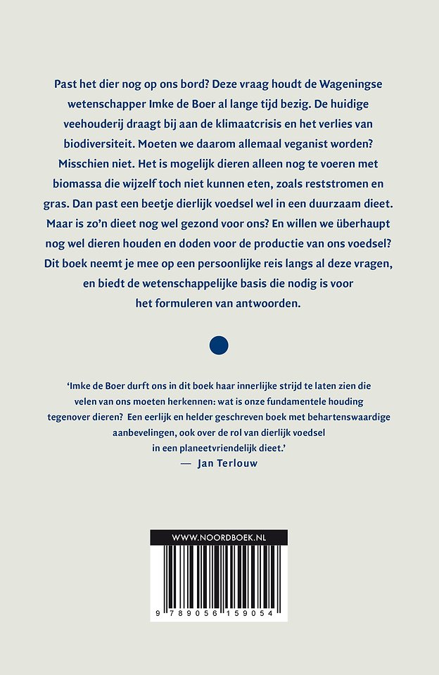 Past het dier nog op ons bord? Deze vraag houdt de Wageningse wetenschapper Imke de Boer al lange tijd bezig. De huidige veehouderij draagt bij aan de klimaatcrisis en het verlies van biodiversiteit. Moeten we daarom allemaal veganist worden? Misschien niet. Het is mogelijk dieren alleen nog te voeren met biomassa die wijzelf toch niet kunnen eten, zoals reststromen en gras. Dan past een beetje dierlijk voedsel wel in een duurzaam dieet. Maar is zo’n dieet nog wel gezond voor ons? En willen we überhaupt nog wel dieren houden en doden voor de productie van ons voedsel? Dit boek neemt je mee op een persoonlijke reis langs al deze vragen, en biedt de wetenschappelijke basis die nodig is voor het formuleren van antwoorden.