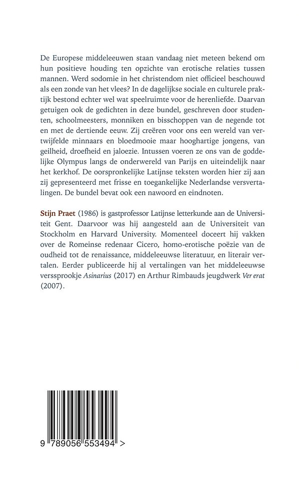 De Europese middeleeuwen staan vandaag niet meteen bekend om hun positieve houding ten opzichte van erotische relaties tussen mannen. Werd sodomie in het christendom niet officieel beschouwd als een zonde van het vlees? In de dagelijkse sociale en culturele praktijk bestond echter wel wat speelruimte voor de mannenliefde. Daarvan getuigen ook de gedichten in deze bundel, geschreven door studenten, schoolmeesters, monniken en bisschoppen van de negende tot en met de dertiende eeuw. Zij creëren voor ons een wereld van vertwijfelde minnaars en bloedmooie maar hooghartige jongens, van geilheid, droefheid en jaloezie. Intussen voeren ze ons van de goddelijke Olympus langs de onderwereld van Parijs om uiteindelijk te belanden op het kerkhof. De oorspronkelijke Latijnse teksten worden hier zij aan zij gepresenteerd met frisse en toegankelijke Nederlandse versvertalingen. De bundel bevat ook een nawoord en eindnoten.