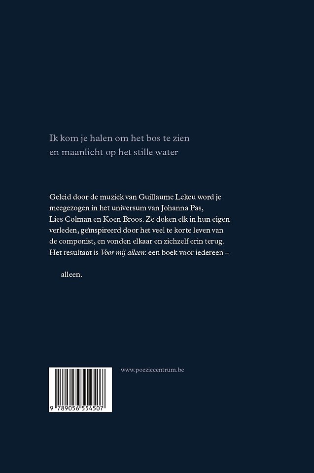 Lies Colman, Koen Broos en Johanna Pas doken in hun eigen verleden als zoekend kunstenaar, en legden de partituren als blauwdruk op hun eigen werk. Het resultaat werd een collectie waarin ingetogen beschouwingen over leven en niet-leven, extase en melancholie, doorheen muziek, poëzie en fotografie aan elkaar worden geregen. Luisterend naar de muziekuitvoering van Lies Colman en Elise Caluwaerts word je meegezogen in het universum van de makers – een boek voor iedereen alleen.