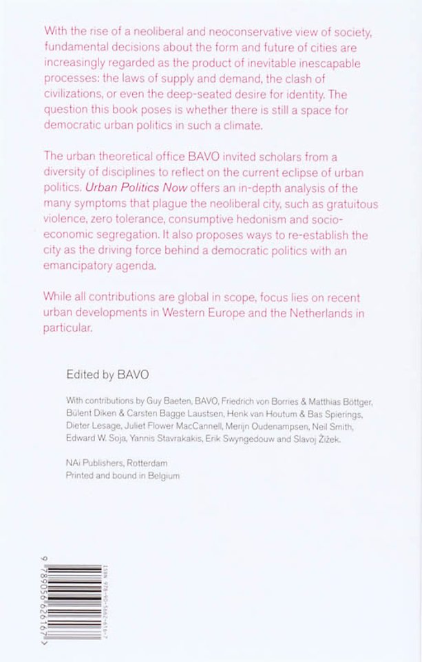 The BAVO bureau for architectural theory invited a group of social geographers, sociologists, philosophers, planners, archi-tects and designers to reflect on the current repudiation of urban politics. Urban Politics Now offers an in-depth analysis of the plague of symptoms that are associated with this, such as gratuitous violence, zero tolerance, consumptive hedonism, socioeconomic polarization. It also proposes ways to re--establish the city as the driver of democratic politics with an emancipatory agenda, rather than one that ratifies the status quo.