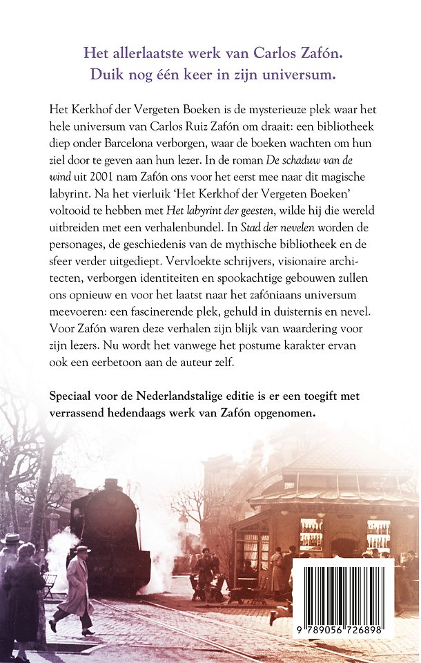 Na de voltooiing van zijn levenswerk, het vierluik ‘Het Kerkhof der Vergeten Boeken’, wilde Carlos Ruiz Zafón die wereld afsluiten met een verhalenbundel. Voor hem was dit werk zijn blijk van waardering voor zijn lezers. Nu wordt het vanwege het postume karakter ook een eerbetoon aan de auteur zelf. Stad der nevelen is een uitbreiding van de literaire wereld uit ‘Het Kerkhof der Vergeten Boeken’. De personages, de geschiedenis van de mythische bibliotheek en de sfeer worden er verder in uitgediept. Vervloekte schrijvers, visionaire architecten, verborgen identiteiten en spookachtige gebouwen zullen ons opnieuw naar het zafóniaans universum brengen: een fascinerende plek, gehuld in duisternis en nevel.