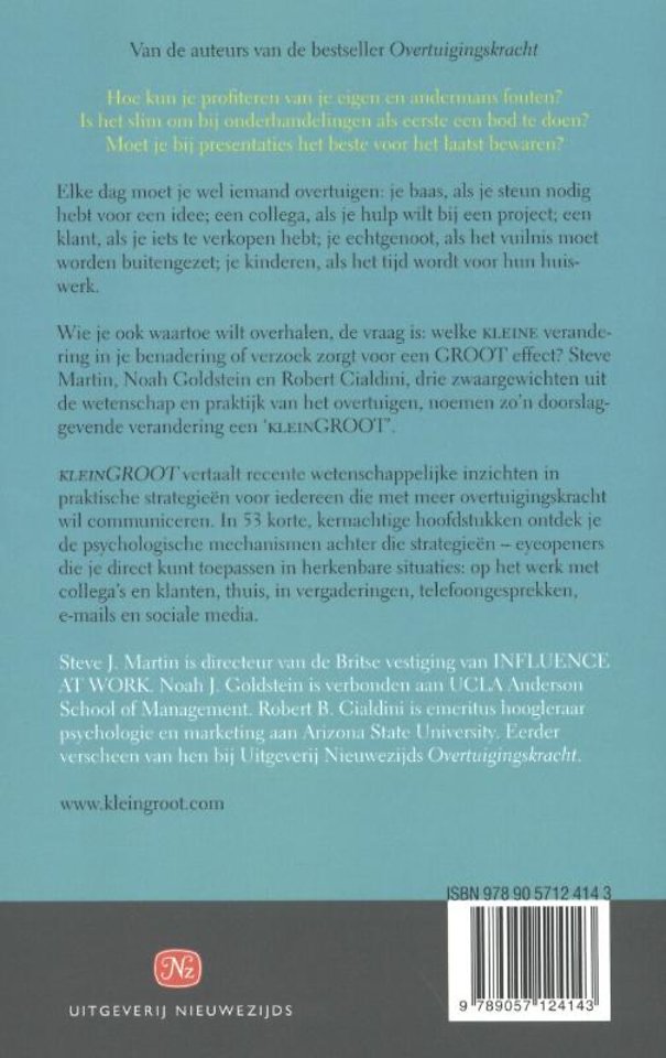 KLEINGROOT vertaalt recente wetenschappelijke inzichten in praktische strategieën voor iedereen die met meer overtuigingskracht wil communiceren. In 53 korte, kernachtige hoofdstukken ontdek je de psychologische mechanismen achter die strategieën - eyeopeners die je direct kunt toepassen in herkenbare situaties: op het werk met collega's en klanten, thuis, in vergaderingen, telefoongesprekken, e-mails en sociale media.