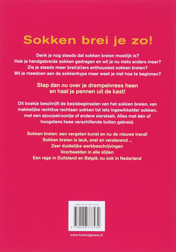 In dit boekje beschrijvan Jo An Luiken en Marlies Hoogland de basis van het sokken breien. Ze leggen je uit hoe je makkelijke rechttoe rechtaan sokken breit tot iets ingewikkelder sokken, met een ajourpatroontje of andere siersteek. Alles met één of hoogstens twee verschillende bollen gebreid. De maten lopen van 22/23 tot 46/47.