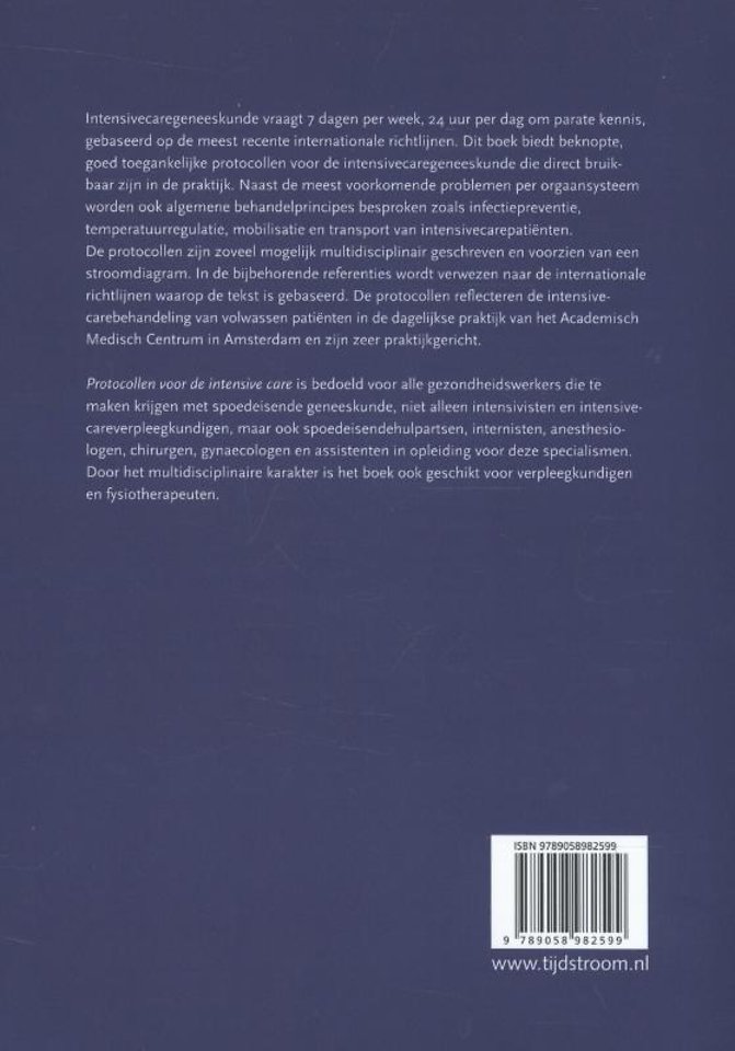 Intensivecaregeneeskunde vraagt 7 dagen per week, 24 uur per dag om parate kennis gebaseerd op de meest recente internationale richtlijnen. Protocollen voor de intensive care voorziet in beknopte, goed toegankelijke handleidingen die direct bruikbaar zijn in de praktijk en die de belangrijkste onderwerpen in de intensivecaregeneeskunde behandelen. Naast de meest voorkomende problemen per orgaansysteem worden ook algemene behandelingsprincipes besproken zoals infectiepreventie, temperatuurregulatie en mobiliseren en transport van intensivecarepatiënten. De protocollen zijn zoveel mogelijk multidisciplinair geschreven en voorzien van een stroomdiagram. In de bijbehorende referenties wordt verwezen naar de internationale richtlijnen waarop de tekst is gebaseerd. De protocollen reflecteren de intensivecarebehandeling van volwassen patiënten in de dagelijkse praktijk van het Academisch Medisch Centrum in Amsterdam en zijn zeer praktijkgericht.
