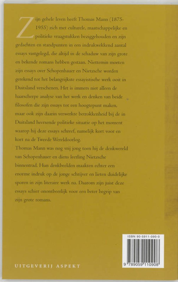 Zijn gehele leven heeft Thomas Mann (1875 - 1955) zich met culturele, maatschappelijke en politieke vraagstukken beziggehouden en zijn gedachten en standpunten in een indrukwekkend aantal essays vastgelegd, die altijd in de schaduw van zijn grote en bekende romans hebben gestaan. Niettemin moeten zijn essays over Schopenhauer en Nietzsche worden gerekend tot het belangrijkste essayistische werk ooit in Duitsland verschenen. Het is immers niet alleen de haarscherpe analyse van het werk en denken van beide filosofen die zijn essays tot een hoogtepunt maken, maar ook zijn daarin verwekte betrokkenheid bij de in Duitsland heersende politieke situatie op het moment waarop hij deze essays schreef, namelijk kort voor en kort na de Tweede Wereldoorlog. Thomas Mann was nog vrij jong toen hij de denkwereld van Schopenhauer en diens leerling Nietzsche binnentrad. Hun denkbeelden maakten echter een enorme indruk op de jonge schrijver en lieten duidelijke sporen in zijn literaire werk na. Daarom zijn juist deze essays schier onontbeerlijk voor een beter begrip van zijn grote romans.