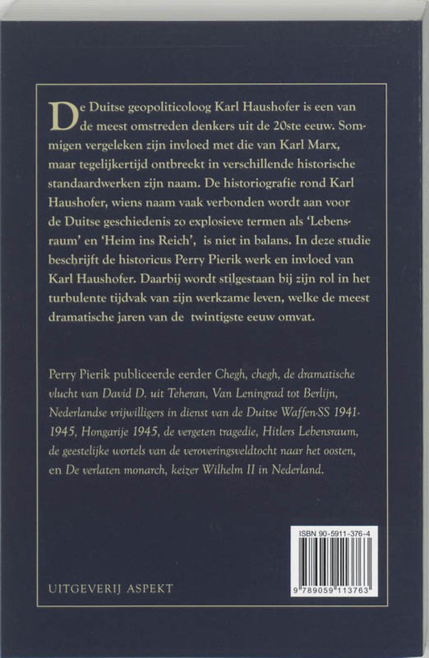De historiografie rond Karl Haushofer, wiens naam vaak verbonden wordt aan voor de Duitse geschiedenis zo explosieve termen als 'Lebensraum' en 'Heim ins Reich', is niet in balans. In deze studie beschrijft de historicus Perry Pierik werk en invloed van Karl Haushofer. Daarbij wordt stilgestaan bij zijn rol in het turbulente tijdvak van zijn werkzame leven, welke de meest dramatische jaren van de twintigste eeuw omvat.