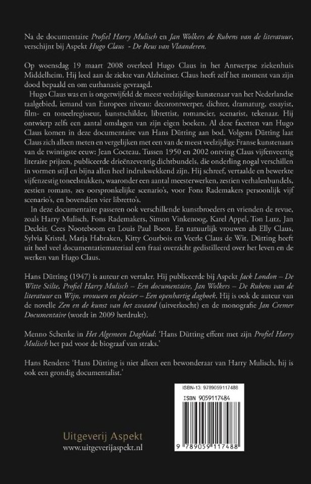 zoals Harry Mulisch, Fons Rademakers, Simon Vinkenoog, Karel Appel, Ton Lutz, Jan Decleir, Cees Nooteboom en Louis Paul Boon. En natuurlijk vrouwen als Elly Claus, Sylvia Kristel, Marja Habraken, Kitty Courbois en Veerle Claus de Wit. Dütting heeft uit heel veel documentatiemateriaal een fraai overzicht gedistilleerd over het leven en de werken van Hugo Claus. Hans Dütting (1947) is auteur en vertaler. Hij publiceerde bij Aspekt Jack London - De Witte Stilte, Profi el Harry Mulisch - Een documentaire, Jan Wolkers - De Rubens van de