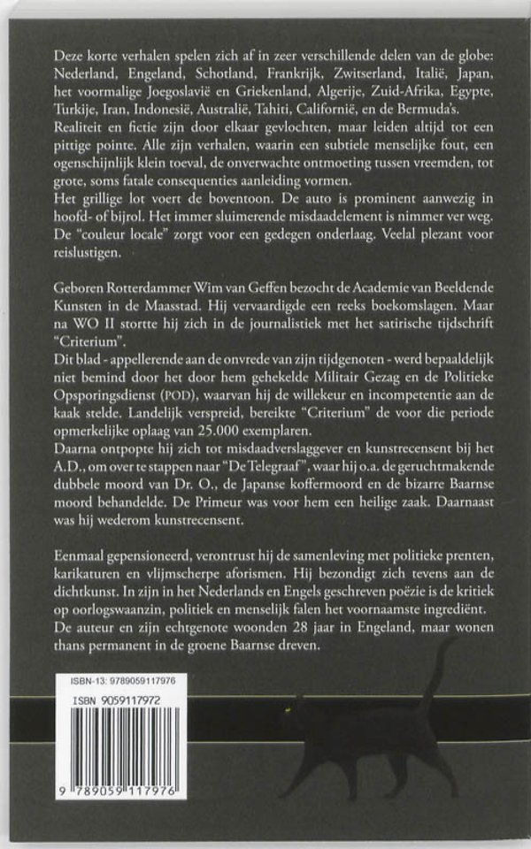 "Realiteit en fictie zijn door elkaar gevlochten, maar leiden altijd tot een pittige pointe. Alle zijn verhalen, waarin een subtiele menselijke fout, een ogenschijnlijk klein toeval, de onverwachte ontmoeting tussen vreemden, tot grote, soms fatale consequenties aanleiding vormen. Het grillige lot voert de boventoon. De auto is prominent aanwezig in hoofd- of bijrol. Het immer sluimerende misdaadelement is nimmer ver weg. De "couleur locale" zorgt voor een gedegen onderlaag. Deze korte verhalen spelen zich af in zeer verschillende delen van de globe: Nederland, Engeland, Schotland, Frankrijk, Zwitserland, Italië, Japan, het voormalige Joegoslavië en Griekenland, Algerije, Zuid-Afrika, Egypte, Turkije, Iran, Indonesië, Australië, Tahiti, Californië, en de Bermuda's. Veelal plezant voor reislustigen."