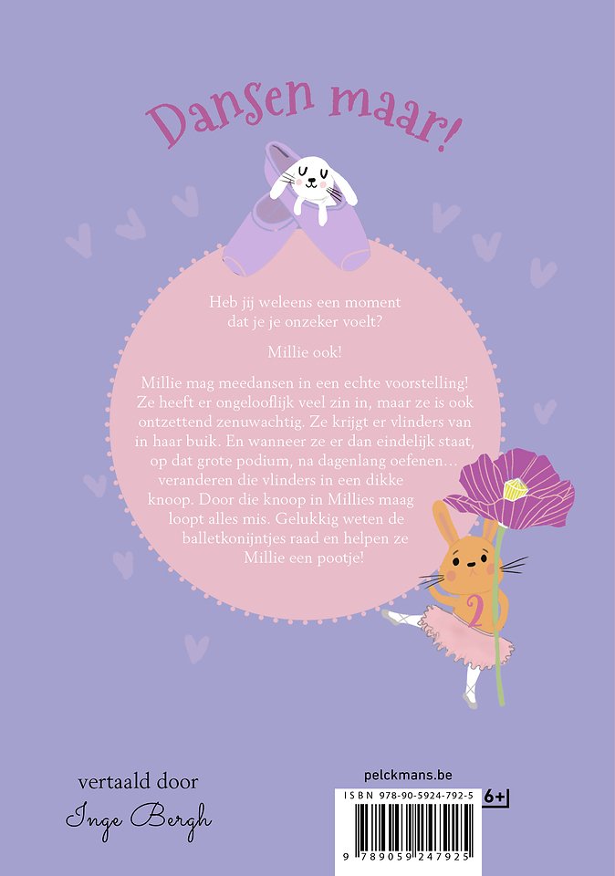 Millie mag meedansen in een echte voorstelling! Ze heeft er ongelooflijk veel zin in, maar ze is ook ontzettend zenuwachtig. Ze krijgt er vlinders van in haar buik. En wanneer ze er dan eindelijk staat, op dat grote podium, na wekenlang oefenen... veranderen die vlinders in een dikke knoop. Door die knoop in Millies maag loopt alles mis. Maar het is niet alleen de plankenkoorts die Millie parten speelt... Amber, een meisje uit de balletles, is niet zo gesteld op Millie en haalt een gemene streek met haar uit. Gelukkig weten de balletkonijntjes raad en helpen ze Millie een pootje! Vertaald door Inge Bergh