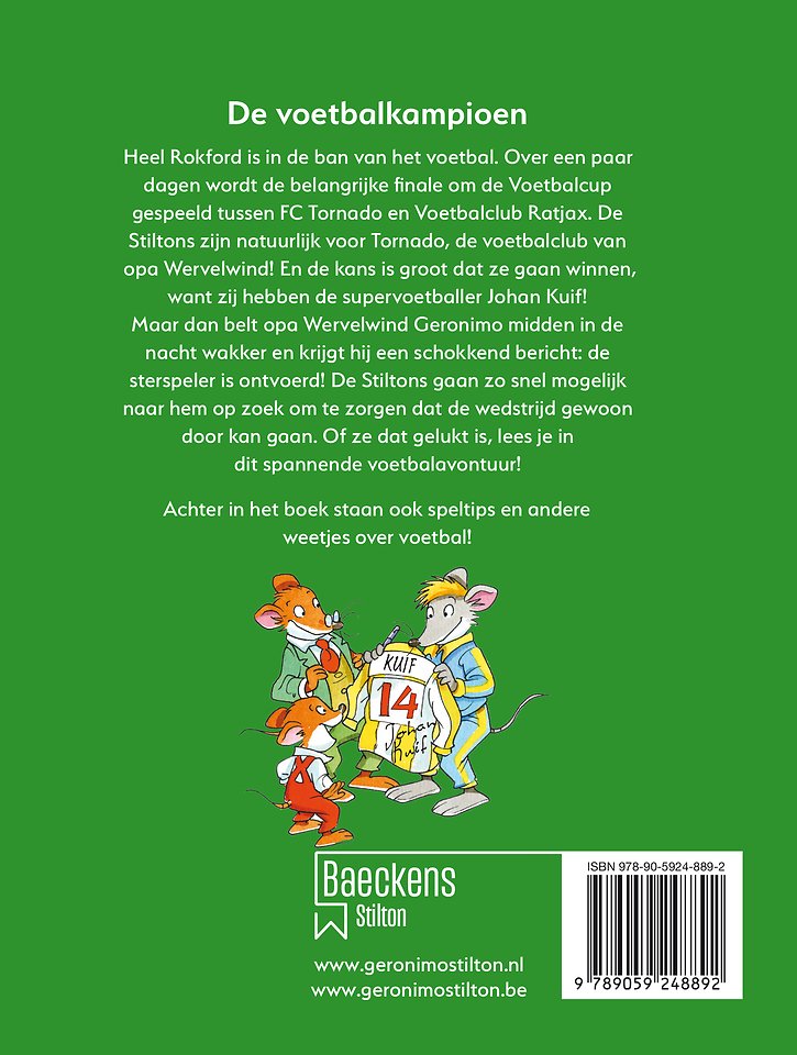 Heel Rokford is in de ban van het voetbal. Over een paar dagen wordt de belangrijke finale om de Voetbalcup gespeeld tussen FC Tornado en Voetbalclub Ratjax. De Stiltons zijn natuurlijk voor Tornado, de voetbalclub van opa Wervelwind! En de kans is groot dat ze gaan winnen, want zij hebben de supervoetballer Johan Kuif! Maar dan belt opa Wervelwind Geronimo midden in de nacht wakker en krijgt hij een schokkend bericht: de sterspeler is ontvoerd! De Stiltons gaan zo snel mogelijk naar hem op zoek om te zorgen dat de wedstrijd gewoon door kan gaan. Of ze dat gelukt is, lees je in dit spannende voetbalavontuur!