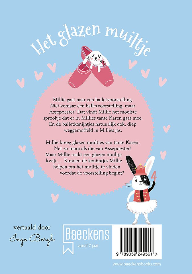 Het wordt een superspannende dag voor Millie, want ze gaat met haar lievelingstante naar een balletvoorstelling! Ze gaan naar Assepoester, Millies favoriete sprookje. Als kers op de taart heeft Millie ook nog eens prachtige glazen muiltjes gekregen! En de konijntjes? Die gaan natuurlijk mee naar het theater, wat denk je! Die zitten lekker knus in Millies jas. Maar dan loopt het mis. Opeens is Millie een glazen muiltje kwijt… Waar is het naartoe? Millie en de konijntjes moeten op onderzoek uitgaan. Het wordt een magisch avontuur…