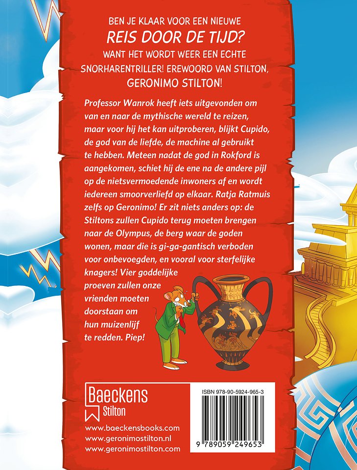 Professor Wanrok heeft een machine uitgevonden om mee naar de mythische oudheid te reizen, maar voor hij hem kan uitproberen komt hij erachter dat iemand hem voor is geweest. En nu heeft Cupido de tijdreismachine te pakken gekregen en is vanaf de Olympus, de berg waar alle Griekse goden wonen, naar Rokford gekomen. Hij schiet er de ene na de andere pijl op de nietsvermoedende inwoners af. Iedereen wordt smoorverliefd op elkaar, zelfs Ratja Ratmuis op Geronimo, dus je kunt wel nagaan hoe ernstig het is. Er zit niets anders op: Geronimo en zijn familie moeten Cupido terug naar de Olympus brengen, maar die is gi-ga-gantisch verboden voor onbevoegden en vooral voor sterfelijke knagers! Vier goddelijke tests zullen onze vrienden moeten ondergaan om hun muizenlijf te redden. Piep!