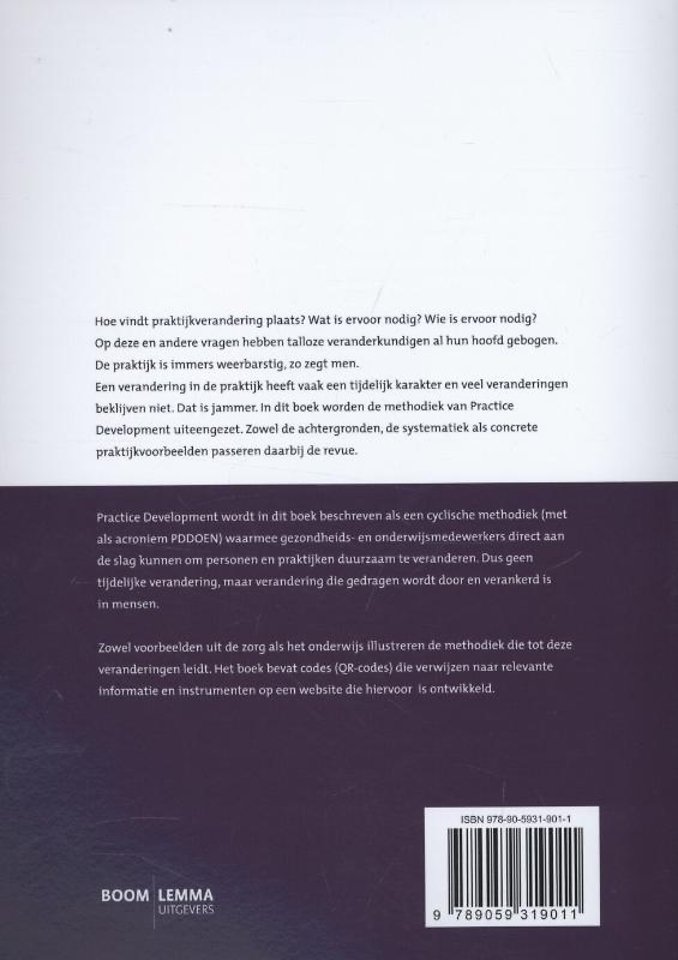 Practice Development wordt in dit boek beschreven als een cyclische methodiek (met als acroniem PDDOEN) waarmee gezondheids- en onderwijsmedewerkers direct aan de slag kunnen om personen en praktijken duurzaam te veranderen. Dus geen tijdelijke verandering, maar verandering die gedragen wordt door en verankerd is in mensen.