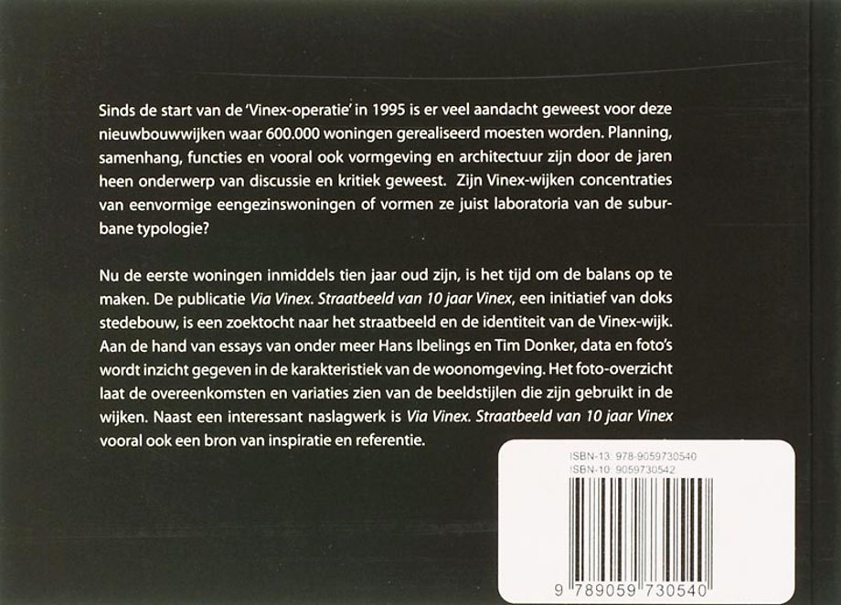 Nu de eerste woningen inmiddels tien jaar oud zijn, is het tijd om de balans op te maken. De publicate Via Vinex. Straatbeeld van 10 jaar Vinex, een initiatief van doks stedebouw, is een zoektocht naar het straatbeeld en de identiteit van de Vinex wijk. Aan de hand van essays van onder meer Hans Ilbelings en Tim Donker, data en foto's wordt inzicht gegeven in de karakteristiek van de woonomgeving. Het foto-overzicht laat de overenkomsten en variatiek zien van de beeldstijlen die zijn gebruikt in de wijken. Naast een interssant naslagwerk is Via Vinex. Straatbeeld van 10 jaar Vinex vooral ook een bron van inspiratie en referentie.