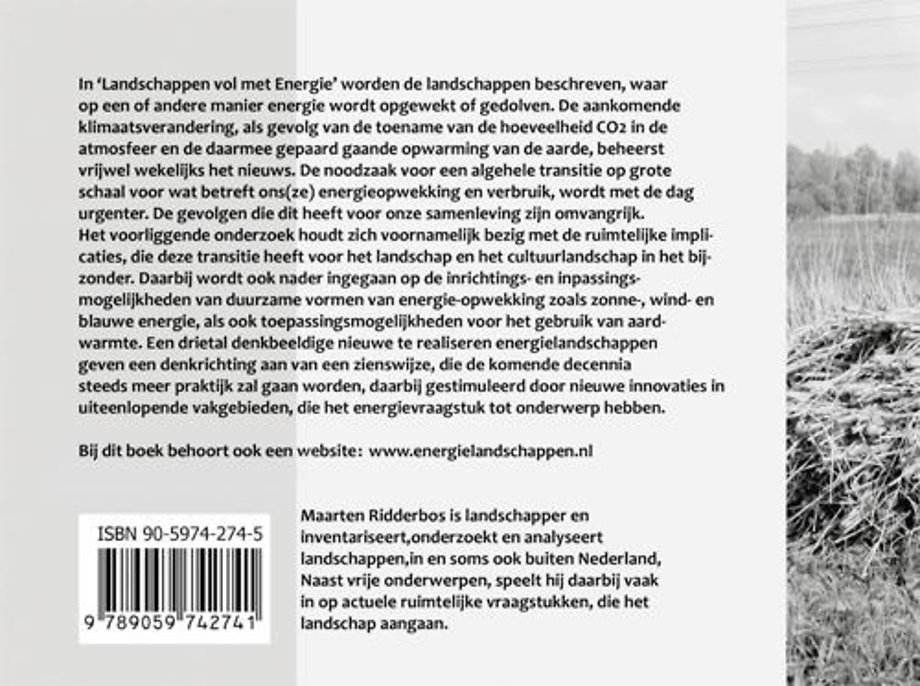 In 'Landschappen vol met Energie' worden de landschappen beschreven, waarop een of andere manier energie wordt opgewekt of gedolven. De aankomende klimaatsverandering, als gevolg van de toename van de hoeveelheid CO2 in de atmosfeer en de daarmee gepaard gaande opwarming van de aarde, beheerst vrijwel wekelijks het nieuws. De noodzaak voor een algehele transitie op grote schaal voor wat betreft ons(ze) energieopwekking en verbruik, wordt met de dag urgenter. De gevolgen die dit heeft voor onze samenleving zijn omvangrijk. Het voorliggende onderzoek houdt zich voornamelijk bezig met de ruimtelijke implicaties, die deze transitie heeft voor het landschap en het cultuurlandschap in het bij zonder. Daarbij wordt ook nader ingegaan op de inrichtings- en inpassingsmogelijkheden van duurzame vormen van energie-opwekking zoals zonne-, wind- en blauwe energie, als toepassingsmogelijkheden voor het gebruik van aardwarmte. Een drietal denkbeeldige nieuwe te realiseren energielandschappen geven een denkrichting aan van een zienswijze, die de komende decennia steeds meer praktijk zal gaan worden, daarbij gestimuleerd door nieuwe innovaties in uiteenlopende vakgebieden, die het energievraagstuk tot onderwerp hebben.