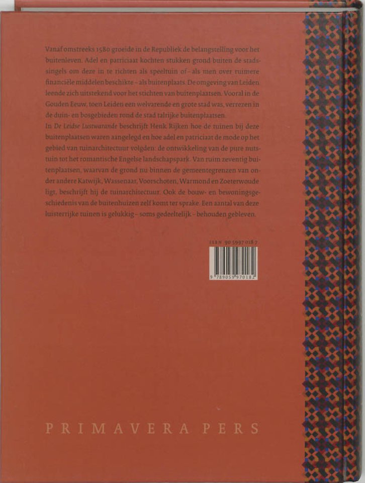 Vanaf ca. 1580 groeide in de Republiek de belangstelling voor het buitenleven. Adel en patriciaat kochten stukken grond buiten de stadssingels om deze in te richten als speeltuin of – als men over ruimere financiële middelen beschikte – als buitenplaats. De omgeving van Leiden leende zich uitstekend voor het stichten van buitenplaatsen. Vooral in de Gouden Eeuw, toen Leiden een welvarende en grote stad was, verrezen in de duin- en bosgebieden talrijke buitenplaatsen. Henk Rijken onderzocht hoe de tuinen bij deze buitenplaatsen waren aangelegd. Van ruim zeventig buitenplaatsen, waarvan de grond nu binnen de gemeentegrenzen van o.a. Katwijk, Wassenaar, Voorschoten, Warmond en Zoeterwoude valt, beschrijft hij de tuinarchitectuur. Ook de de bouw- en bewoningsgeschiedenis van de buitenhuizen zelf wordt daarbij behandeld. Deze uitgebreide en rijk geïllustreerde studie is niet alleen in regionaal-historisch opzicht van belang; door het grote aantal tuinen dat wordt beschreven levert Rijken ook een bijdrage aan de geschiedschrijving van de Nederlandse tuin- en landschapsarchitectuur. Rijken promoveerde op dit onderwerp aan de Universiteit van Leiden. Voor deze uitgave is de tekst van het proefschrift bewerkt en zijn talloze nieuwe foto’s gemaakt.