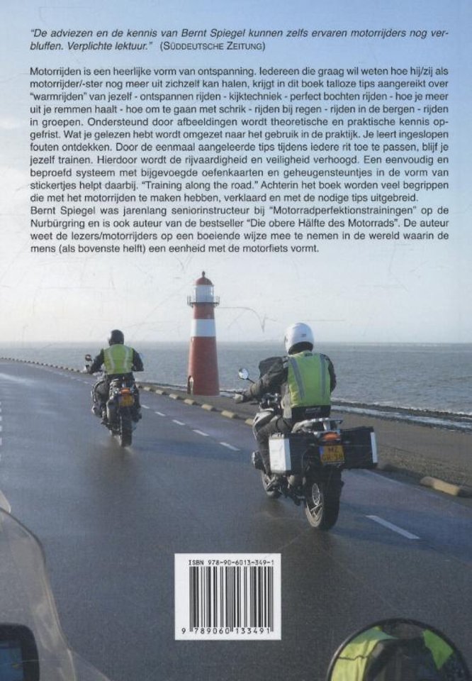 Motorrijden is een heerlijke vorm van ontspanning. Iedereen die graag wil weten hoe hij/zij als motorrijder/-ster nog meer uit zichzelf kan halen, krijgt in dit boek talloze tips aangereikt over "warmrijden" van jezelf - ontspannen rijden - kijktechniek -perfect bochten rijden - hoe je meer uit je remmen haalt - hoe om te gaan met schrik - rijden bij regen- rijden in de bergen - rijden in groepen. Door het lezen over deze onderwerpen wordt theoretische en praktische kennis opgefrist en uitgebreid. De foto's en tekeningen ondersteunen daarbij. Maar dan begint het pas. Wat je gelezen hebt wordt omgezet naar het gebruik in de praktijk. Je leert ingeslopen fouten ontdekken. Door middel van dagelijkse training worden processen aangeleerd en steeds verbeterd. Hierdoor wordt de rijvaardigheid en veiligheid verhoogd. Je wordt daarbij geholpen door een eenvoudig en beproefd systeem met bijgevoegde oefenkaarten en geheugensteuntjes in de vorm van stickertjes. "Training along the road." Door de eenmaal aangeleerde tips tijdens iedere rit toe te passen, blijf je jezelf trainen. Achterin het boek worden nog eens meer dan 150 begrippen die met het motorrijden te maken hebben, verklaard en met de nodige tips uitgebreid. Bernt Spiegel was jarenlang seniorinstructeur bij "Motorradperfektionstrainingen" op de Nurbürgring en is ook auteur van de bestseller "Die obere Hälfte des Motorrads". De auteur weet de lezers/motorrijders op een boeiende wijze mee te nemen in de wereld waarin de mens (als bovenste helft) een eenheid met de motorfiets vormt.