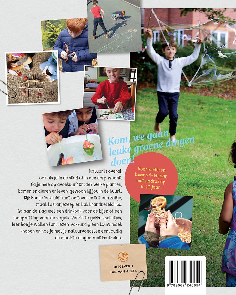 Natuur is overal, ook als je in de stad of in een dorp woont. Ga je mee op avontuur? Ontdek welke planten, bomen en dieren er leven, gewoon bij jou in de buurt. Kijk hoe je ‘onkruid’ kunt omtoveren tot een zalfje, maak kastanjezeep en bak brandnetelchips. Ga aan de slag met een drinkbak voor de bijen of een snoepketting voor de vogels. Verzin te gekke spelletjes, leer hoe je wolken kunt lezen, vakkundig een touw moet knopen en hoe je met je natuurvondsten eenvoudig de mooiste dingen kunt knutselen.