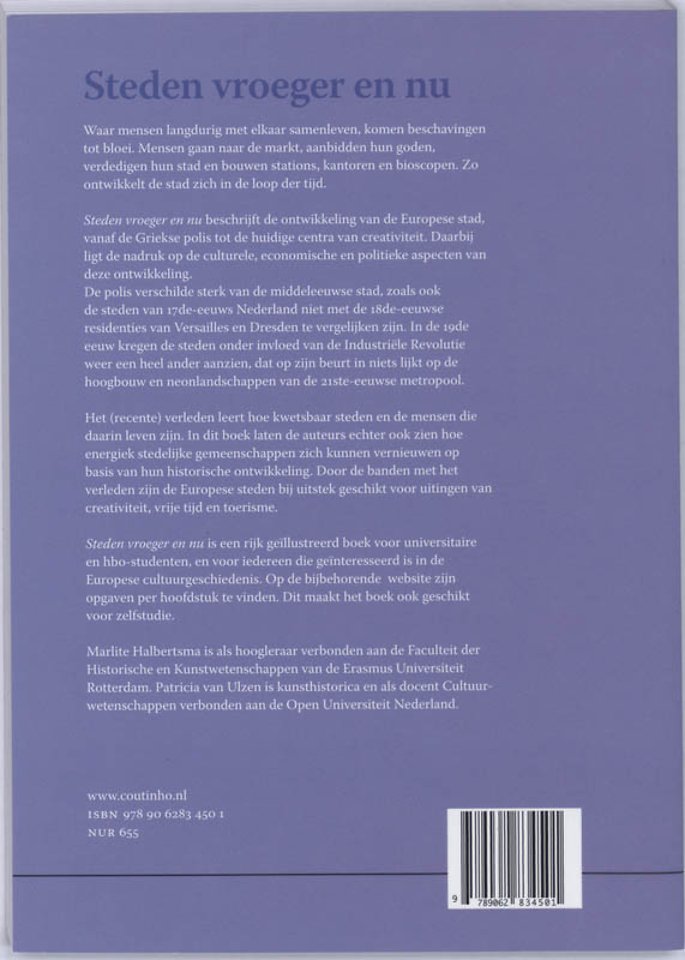 Steden vroeger en nu is een rijk geïllustreerd boek voor universitaire en hbo-studenten, en voor iedereen die geïnteresseerd is in de Europese cultuurgeschiedenis. Op de bijbehorende website zijn opgaven per hoofdstuk te vinden. Dit maakt het boek ook geschikt voor zelfstudie.