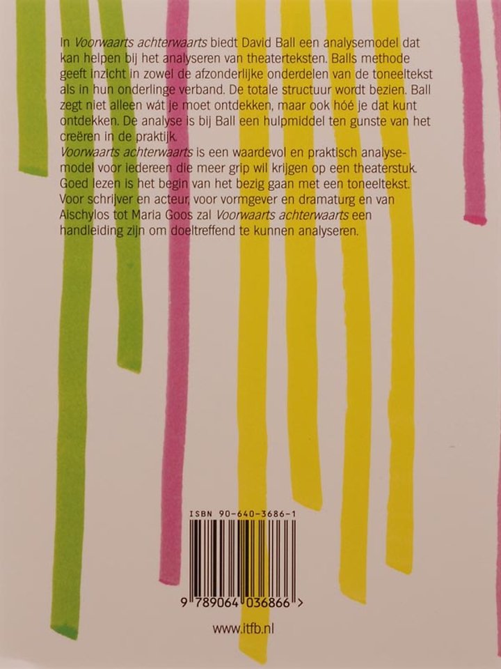 In Voorwaarts achterwaarts biedt David Ball een analysemodel dat kan helpen bij het analyseren van theaterteksten. Balls methode geeft inzicht in zowel de afzonderlijke onderdelen van de toneeltekst als in hun onderlinge verband. De totale structuur wordt bezien. Ball zegt niet alleen w je moet ontdekken, maar ook h e dat kunt ontdekken. De analyse is bij Ball een hulpmiddel ten gunste van het cre n in de praktijk.