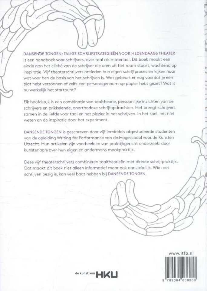 Dansende tongen is een handboek voor schrijvers, over taal als materiaal. Dit boek maakt een einde aan het cliché van de schrijver die uren uit het raam staart, wachtend op inspiratie. Vijf theaterschrijvers ontleden hun eigen schrijfproces en kijken naar wat voor hen de basis van het schrijven is. Wat gebeurt er nog voordat je een plot hebt verzonnen of zelfs een personagenaam op papier hebt gezet? Wat is nu werkelijk het startpunt?