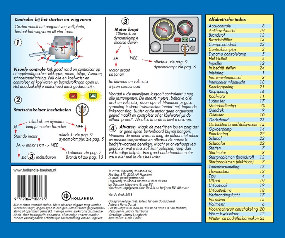 Een praktisch boek voor al die zeilers en motorbootschippers die zelf willen sleutelen aan hun dieselmotor of eigenhandig motorstoringen willen verhelpen. 'Boordboek Scheepsdiesels' bevat allerlei nuttige tips en trucs en daarmee lost u het motorprobleem vaak zo op. Ook periodiek onderhoud wordt in dit boek beschreven. Dit alles wordt ondersteund door veel duidelijke illustraties in kleur. U kunt de bladzijden gerust met natte of vette vingers omslaan omdat ze allemaal van stevig karton zijn en waterafstotend gelamineerd.
