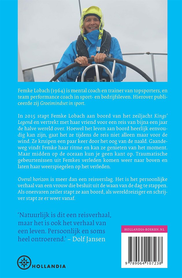 Het is 2015 als Femke Lobach met haar vriend aan boord van het zeiljacht Kings' Legend stapt en begint aan hun halve wereldreis. Ze is een onervaren zeiler en tijdens hun reizen in het Caribisch gebied en over de Indische Oceaan kruipen ze een paar keer door het oog van de naald. Toch vindt ze haar ritme en leert ze te genieten van het moment. Tegelijkertijd komen midden op zee traumatische gebeurtenissen uit haar jeugd boven, die haar laten weerspiegelen op het verleden. Overal horizon is meer dan alleen een spannend reisverslag: het is een persoonlijk verhaal van een vrouw die besluit uit de waan van de dag te stappen.