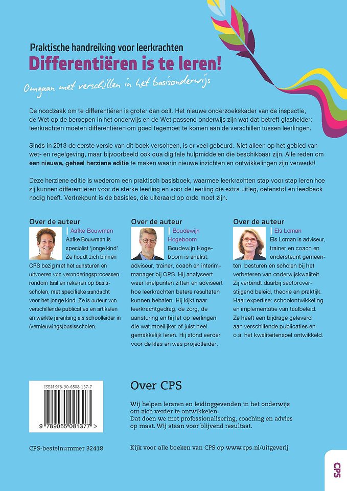 Deze herziene editie is wederom een praktisch basisboek, waarmee leerkrachten stap voor stap leren hoe zij kunnen differentiëren voor de slimme leerling en voor de leerling die extra uitleg, oefenstof en feedback nodig heeft. Vertrekpunt is de basisles, die uiteraard op orde moet zijn.