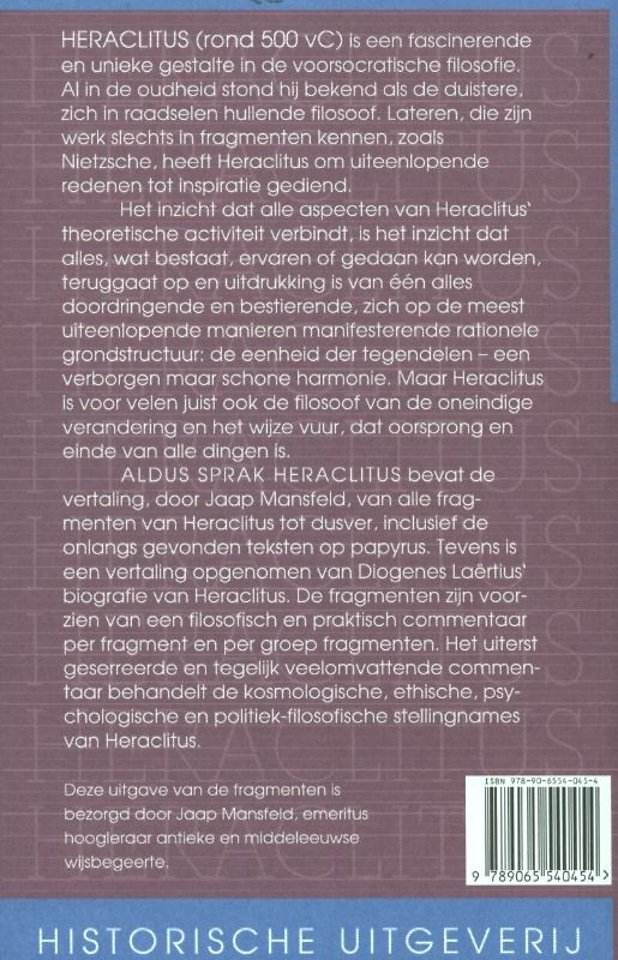 Aldus sprak Heraclitus bevat de vertaling, door Jaap Mansfeld, van alle fragmenten van Heraclitus tot dusver, inclusief de onlangs gevonden teksten op papyrus. Tevens is een vertaling toegevoegd van Diogenes Laërtius' biografie van Heraclitus. De fragmenten zijn voorzien van een filosofisch en praktisch commentaar per fragment en per groep fragmenten. Het uiterst doeltreffende en tegelijk veelomvattende commentaar behandelt de kosmologische, ethische, psychologische en politiek-filosofische stellingnames van Heraclitus.