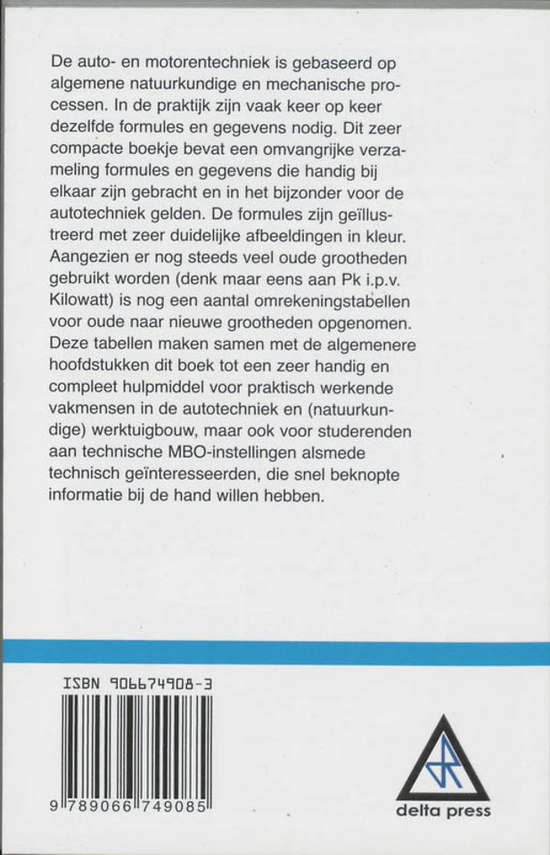 De formules zijn geïllustreerd met zeer duidelijke afbeeldingen in kleur. Aangezien er nog veel oude grootheden worden gebruikt (denk aan Pk i.p.v. Kilowatt) is nog een aantal omrekeningstabellen voor oude naar nieuwe grootheden opgenomen. Deze tabellen maken samen met de algemenere hoofdstukken dit boek tot een zeer handig en compleet hulpmiddel voor praktisch werkende vakmensen in de autotechniek en (natuurkundige) werktuigbouw, maar ook voor studerenden aan de technische mbo-instellingen alsmede technisch geïnteresseerden, die snel beknopte informatie bij de hand willen hebben.
