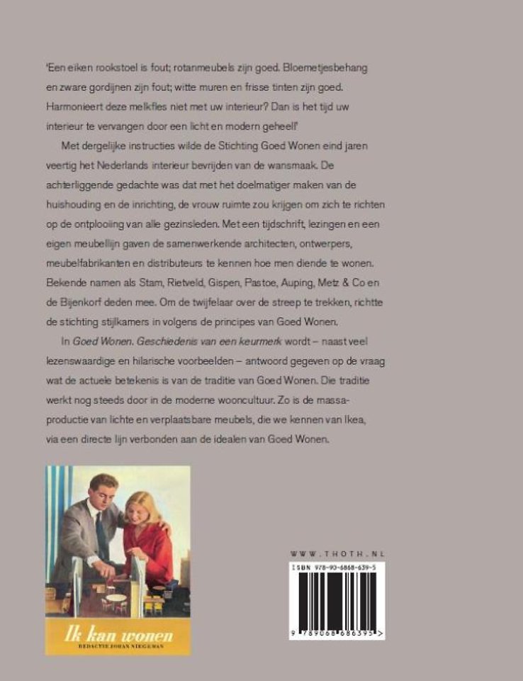 In "Goed Wonen. Geschiedenis van een keurmerk" wordt - naast veel lezenswaardige en hilarische voorbeelden - antwoord gegeven op de vraag wat de actuele betekenis is van de traditie van Goed Wonen. Die traditie werkt nog steeds door in de moderne wooncultuur. Zo is de massaproductie van lichte en verplaatsbare meubels, die we kennen van Ikea, via een directe lijn verbonden aan de idealen van Goed Wonen.