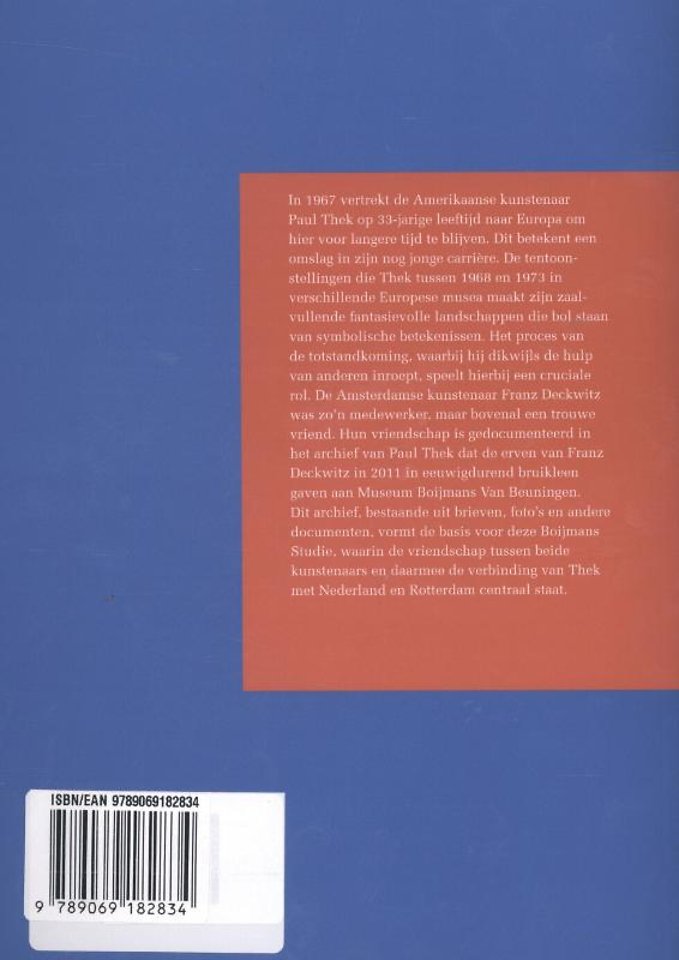 In 1967 the American artist Paul Thek embarked on an extended stay in Europe. This represented a turning point in his career. The environments that he created between 1968 and 1973 in various European museums were made up of fantasy landscapes replete with symbolic meaning. The creative process, usually with the assistance of others, played a crucial role in these exhibitions. The Amsterdam-based artist Franz Deckwitz was one of those who assisted Thek but he was, above all, a loyal friend. Their friendship is documented in the Paul Thek archive that Deckwitz's family gave on permanent loan to Museum Boijmans Van Beuningen in 2011. Comprising letters, photographs and other documents, it forms the basis of this Boijmans Study.