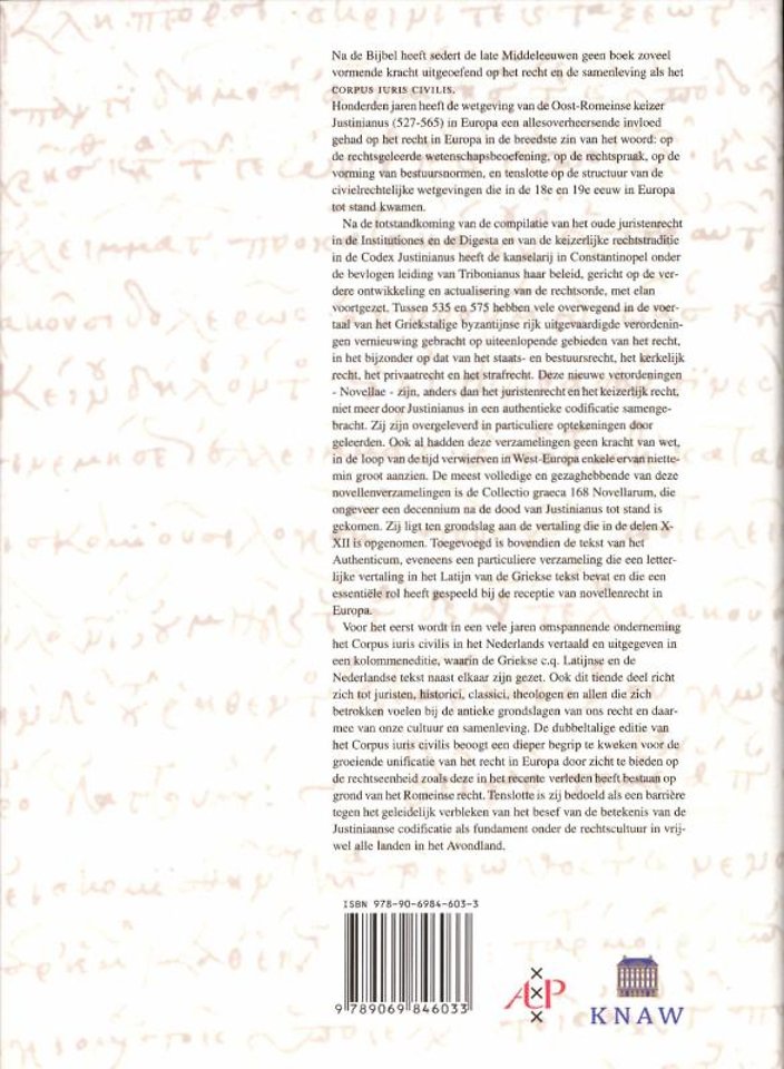 De meest volledige en gezaghebbende van deze novellenverzamelingen is de Collectio graeca 168 Novellarum, die ongeveer een decennium na de dood van Justinianus tot stand is gekomen. Zij ligt ten grondslag aan de vertaling die in de delen x-xii is opgenomen. Toegevoegd is bovendien de tekst van het Authenticum, eveneens een particuliere verzameling die een letterlijke vertaling in het Latijn van de Griekse tekst bevat en die een essentiële rol heeft gespeeld bij de receptie van novellenrecht in Europa.
